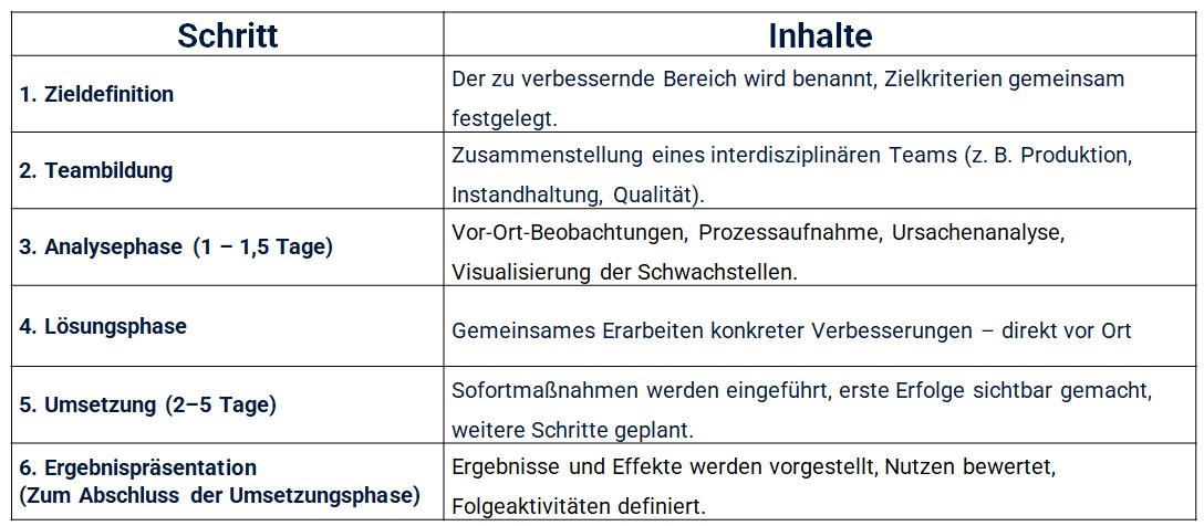 Ein Kaizen-Workshop schafft genau hier den Durchbruch. Strukturiert, teamorientiert und direkt im Prozess – mit dem Ziel, konkrete, nachhaltige Verbesserungen umzusetzen.